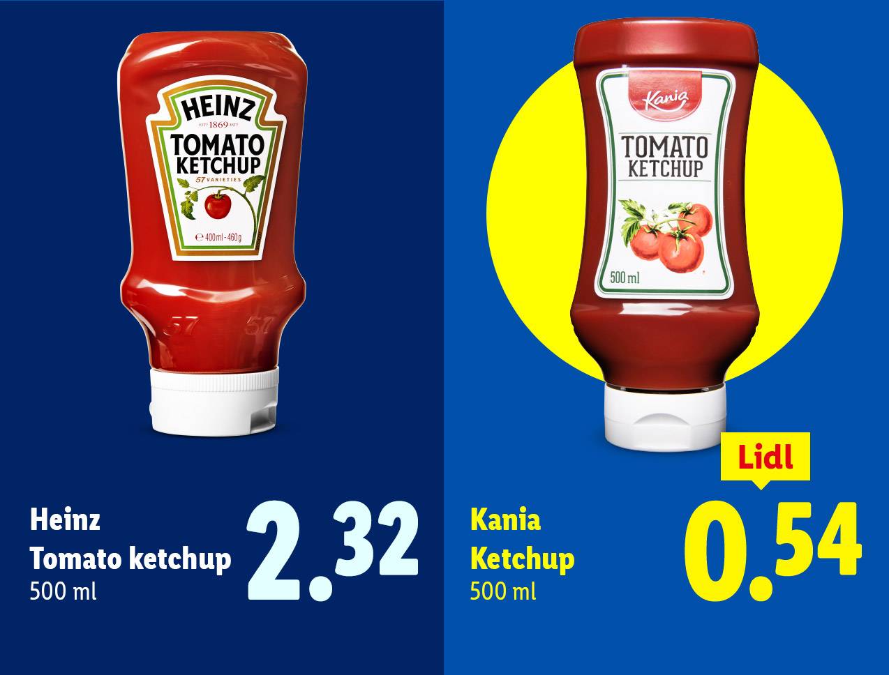 Heinz ketchup Lidl Prijs: 2,65 Eenheid: 570 ml Omgerekende prijs voor 500 ml: 2,32