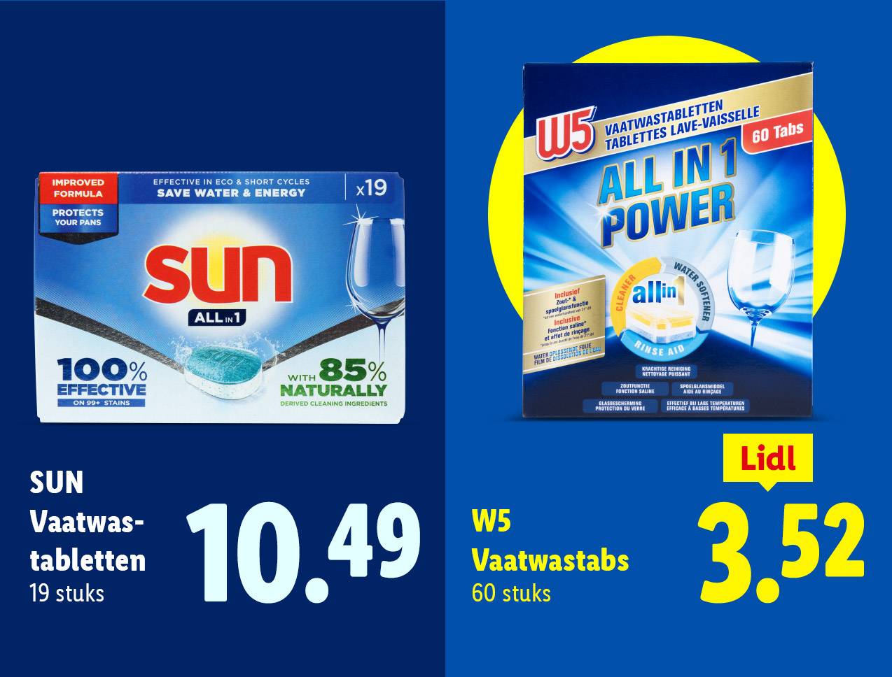 W5 vaatwastabs Lidl Prijs: 3,52 Eenheid: 60 tabs Prijs per tab: €0,06